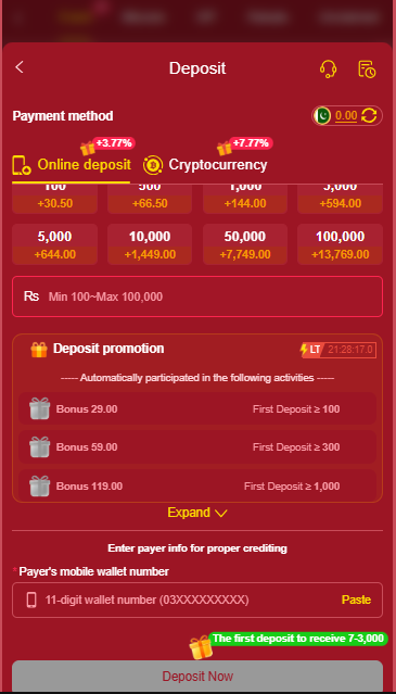- Select Deposit and choose your preferred method (e.g., JazzCash, EasyPaisa).